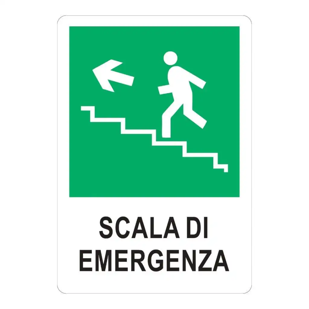 Il cartello “Scale di emergenza” a sinistra è una componente essenziale della segnaletica di sicurezza, progettata per indicare chiaramente la posizione delle scale di evacuazione da utilizzare in caso di emergenza.