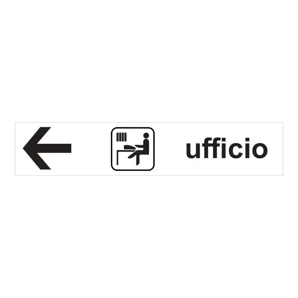 Il formato 125×25 cm assicura ottima visibilità, mentre la freccia rivolta a sinistra indica chiaramente la direzione dell’ufficio.