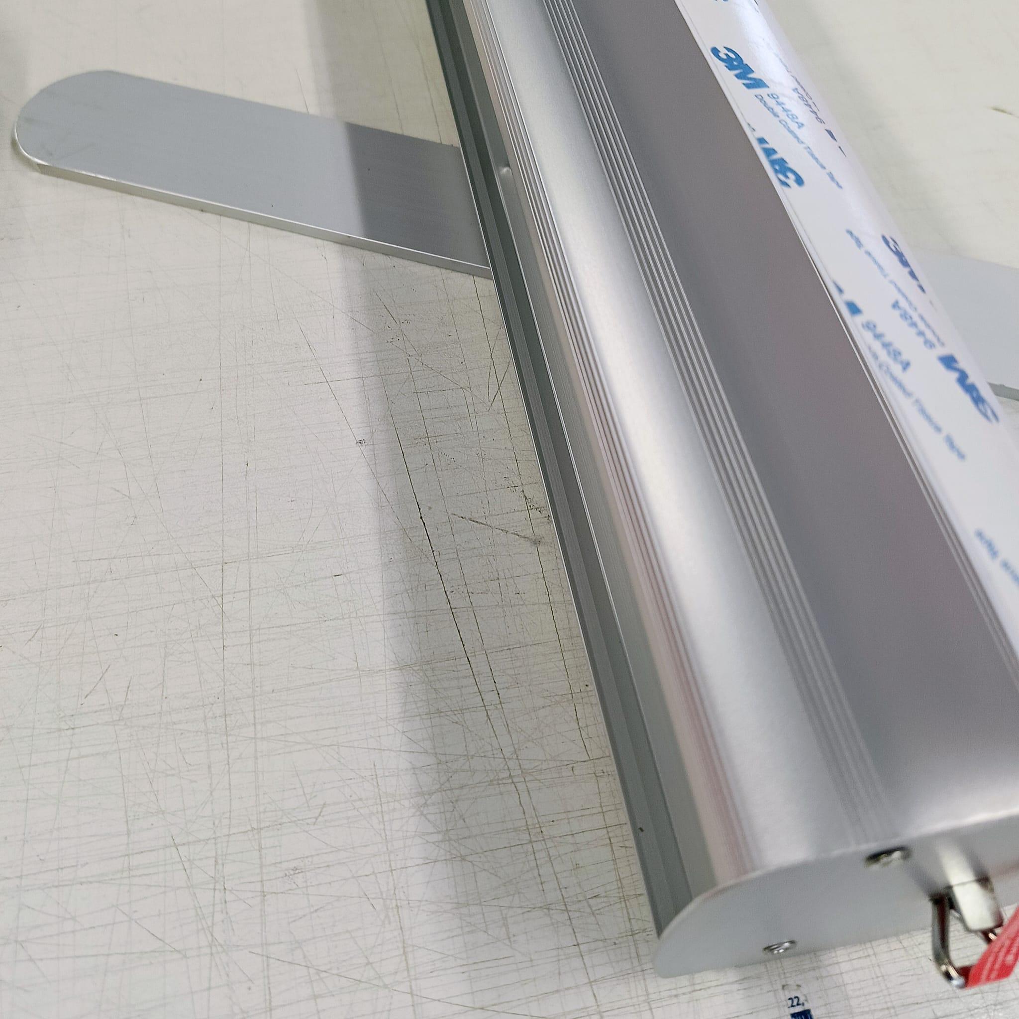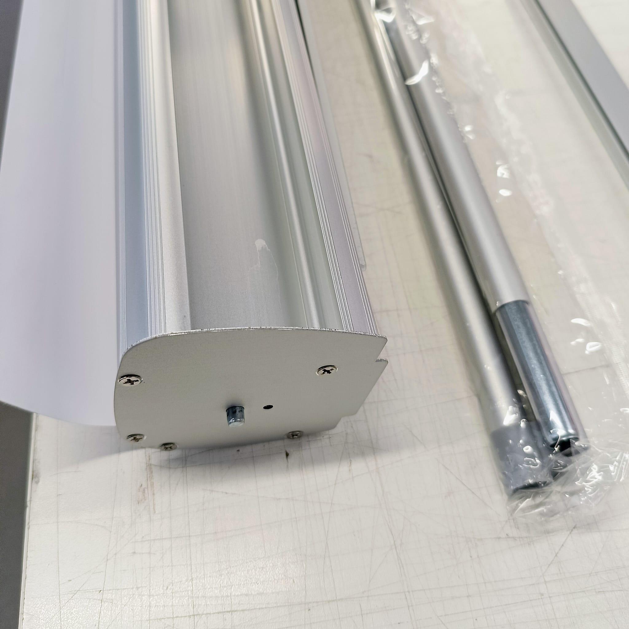 Questo roll up è un prodotto premium dotato di riavvolgitore in alluminio anodizzato, considerato da anni uno standard di riferimento per affidabilità e durata. I laterali e la barra superiore sono anch’essi in alluminio anodizzato, conferendo al prodotto un aspetto professionale e una robustezza superiore alla media. L’asta verticale è composta da un segmento intermedio da 0,87 mm, mentre i piedini arrotondati da 5 mm garantiscono una buona stabilità.